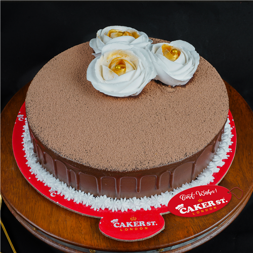 Experience our Ultimate Chocolate Bliss! Moist chocolate sponge soaked in sugar syrup, layered with indulgent Belgian chocolate ganache, and topped with fluffy whipped cream and a dusting of drinking chocolate powder. A rich and creamy delight for true chocolate aficionados.