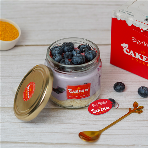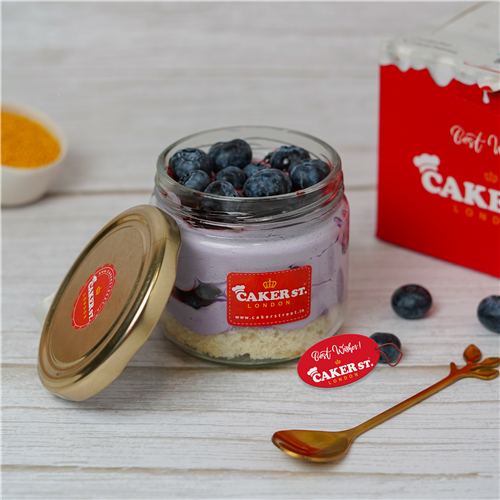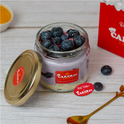 Indulge in our Blueberry Vanilla Cake Jar, featuring moist vanilla sponge soaked in sugar syrup, layered with fluffy whipped cream and luscious blueberry fruit filling. Topped with a chocolate garnish and fresh blueberries, this treat offers a delightful mix of creamy, fruity, and chocolatey goodness.