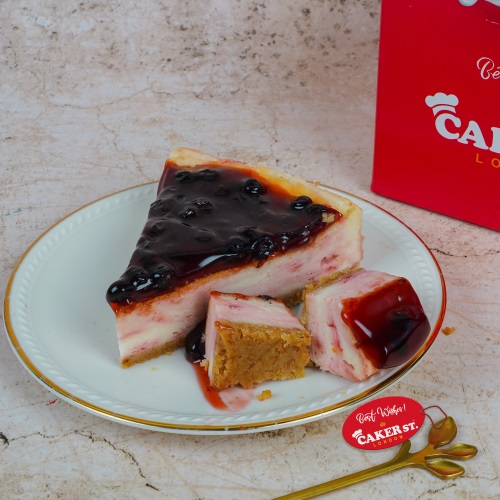 Enjoy our Blueberry Cheesecake Slice—a delectable treat with a buttery cookies base, topped with luscious blueberry fruit filling. Each slice is crafted with fresh cream, unsalted butter, sugar, and milk, and finished with a smooth layer of cheese cream. Perfectly balanced for a sweet and creamy indulgence.