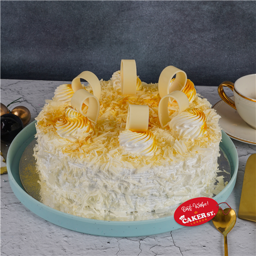 Delight in our Vanilla Sponge Cake with whipped cream, sugar syrup, white chocolate, golden dust, and a hint of vanilla flavor. A sophisticated and sweet indulgence!