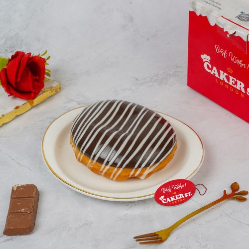 Enjoy a delectable donut crafted with all-purpose flour and maida for a light, tender crumb. Butter and sugar blend with yeast and gluten to create a fluffy texture, while a touch of salt and milk powder enhances the flavor. Enriched with improver powder for added softness, each donut is elegantly finished with a swirl of smooth white chocolate and rich dark chocolate, offering a delicious contrast of creamy and intense cocoa flavors in every bite.
