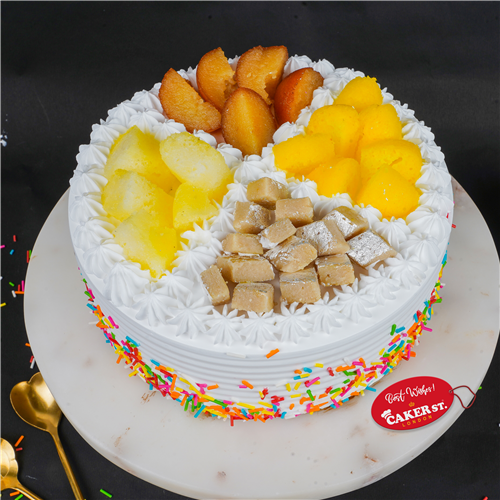 Savor our Royal Fusion Cake! Light vanilla sponge soaked in milk syrup, layered with creamy whipped cream and a luxurious blend of gulab jamun, rasmalai, kaju katli, and cheese cream filling. A rich, indulgent dessert that combines traditional flavors in a decadent treat.