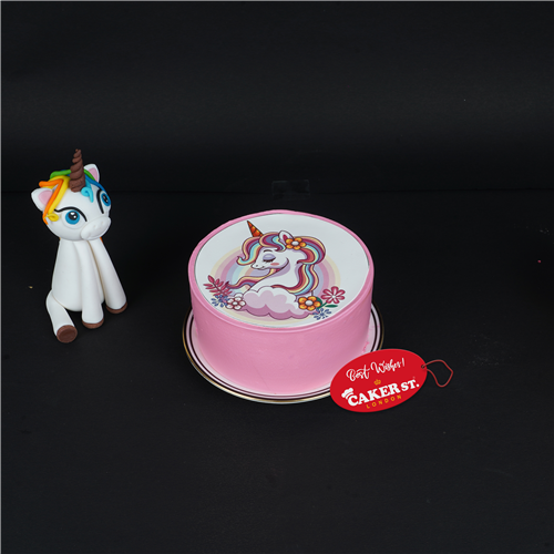 Delight in a soft vanilla sponge soaked in sugar syrup, filled with sweet strawberry crush, and topped with creamy whipped cream. Adorned with a charming unicorn photo, this cake brings magic to every bite!