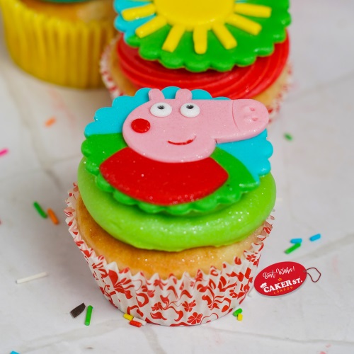 These Peppa Pig cupcakes are a delightful treat for fans of all ages! Featuring a soft, moist base made from refined wheat and sugar, each cupcake is infused with creamy vanilla and white chocolate. Topped with a rich cheese frosting and decorated with playful sugar paste details, they include a touch of pistachio for a unique flavor twist. Perfect for any celebration, these cupcakes bring a sprinkle of fun and sweetness to your festivities!