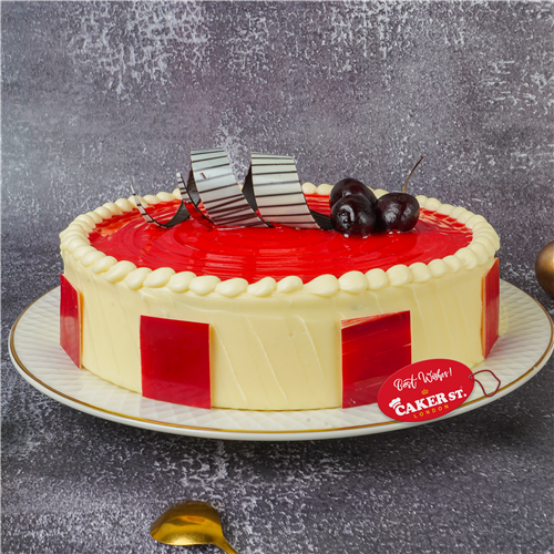 Delight in this decadent red velvet sponge layered with creamy cream cheese and rich white chocolate ganache. Enhanced with sugar syrup and topped with smooth unsalted butter and fresh cream, this cake is finished with a fruity strawberry jelly and elegant chocolate garnish for an indulgent touch.