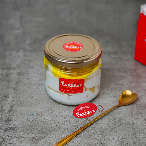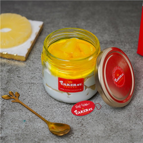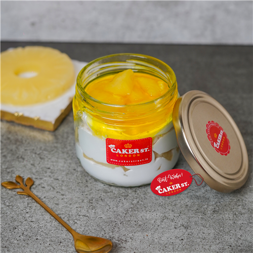 Delight in our Pineapple Vanilla Cake Jar, showcasing layers of soft vanilla sponge soaked in sugar syrup, creamy cheese cream, and fluffy whipped cream. Enhanced with tangy pineapple fruit and a smooth pineapple jelly, this dessert offers a refreshing and indulgent tropical experience.